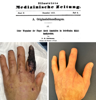 AbstractIntroduction Recent publications see the controversy between primary and secondary transmetacarpal resection (also known as the “Adelmann” operation) versus finger amputation at the level of the proximal phalanx in favor of the transmetacarpal resection in the case of a functionally disturbing basal phalanx stump or, for aesthetic reasons. The available publications do not differentiate significantly between the resections of the rays II-V. This paper examines cases of II ray resections and presents the results. It will be checked whether the results agree with the current literature. Material and method We compiled 7 cases of primary and secondary ray resections (3 primary/4 secondary) of the II ray at the mid-metacarpal level and examined the long-term results in regards of function, including loss of strength in strength grip and fine grip, and pain. The results are presented. Results: The loss of strength in the transmetcarpal (II ray) amputee hands was on average 30% for both the strenght grip and the fine grip. Relevant neuroma pain was evident only in one of the cases. All patients would have the procedure performed again. The results are in good agreement with the, albeit sparse, literature. Discussion: In the past, transmetacarpal resections were often not recommended because the procedure may lead to a greater loss of hand strength than finger amputation at the level of the proximal phalanx. Our follow-up study in isolated cases with ray II resection cannot confirm this belief. The loss of strength was on average 30% for different grip types and is therefore of the same order of magnitude as the loss of strength reported in the literature for isolated index finger amputation at the level of the proximal phalanx. We can therefore recommend transmetacarpal resection in both primary and secondary cases, such as Adelmannn did already in 1852. However, Adelmann himself never performed this procedure for ray II, but he only recommended it. Moreover, Adelmann wrote in his paper in 1882, that the first description of this kind of operation must be attributed to Lorenz Heister and therefore the operation should be called “Heister-Adelmann” operation. ![]() |