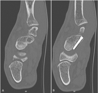 AbstractIntroduction: Attritional rupture of the flexor pollicis longus (FPL) tendon has been described in cases of friction on a palmar distal radius osteosynthesis plates. We present a case of an attritional rupture of the FPL tendon by a retrograde scaphoid screw inserted two years earlier. Commonly accepted surgical therapy of attritional tendon rupture is tendon reconstruction or tendon transfer. In this particular case a primary suture was performed. Materials and Methods: A 43-year-old high-level rock climber suffered a displaced fracture of the middle third of the scaphoid. The pre-operative ct scan revealed a bone cyst in the distal part of the scaphoid (Figure 1A). Due to this cyst, the retrograde Herbert like screw was inserted close to the palmar cortex to have the best hold in the bone (Figure 1B). Fracture healing was achieved after 6 weeks and the post-operative follow up remained unremarkable without any patient complaint. Two years later during an inverted grip in climbing (finger and thumb flexion with wrist hyperextension), the patient experienced a rupture of the FPL tendon due to palmar overhand. The palmar radiocarpal joint capsule was perforated (Figure 2). The screw protruding from the palmar surface of the scaphoid was removed. The FPL rupture was oblique and acute in appearance. Contact between the two stumps was easy and did not induce excess flexion of the thumb, which is why we opted for a direct suture and not an intercalated graft. Direct suture of the FPL tendon was performed using the Lim-Tsai technique (Supramid) and reinforced with a Krakow suture (FiberWire). Results: At three months post-operatively, the thumb's range of motion was almost complete : MCP flexion/extension was 40-0-0° (50-0-0°) and IP flexion/extension was 70-0-0° (70-0-0°). Wrist flexion/extension was 60-0-60° (70-0-70°). The patient resumed climbing at six months post-operatively. Conclusion: A retrograde scaphoid screw with palmar overhang is a risk for attritional FPL tendon rupture. Even asymptomatic retrograde screw with palmar overhang should be removed. Attritional tendon rupture with limited attritional zone can be sutured primarily. ![]() ![]() |
