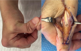 Material and methods We present 2 patients with rheumatoid thumb deformity that have been treated using the modified extensor pollicis longus (EPL) rerouting technique. The EPL was split longitudinally and divided distally. Synovial tissue surrounding MP joint was excised. A transosseous tunnel was drilled from dorsal to ulnar at the base of the proximal phalanx, through which the EPL was passed. Tension was adjusted to maintain the MP joint in 10° of flexion and fixed with a 2.5 mm interference screw inserted dorsally. The remaining EPL tendon was then secured on the ulnar side of the metacarpal head to reconstruct the ulnar collateral ligament (see Figure).