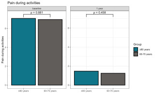 AbstractAim: The safety and efficacy of thumb carpometacarpal (CMC) implant arthroplasty in older patients remains uncertain, particularly due to the potential impact of osteoporosis on implant integration. The aim of this study was to investigate whether outcomes at one year post-surgery are comparable in patients over 80 years of age compared to those aged 60–70 years. Methods: This prospective registry-based study included patients who underwent thumb CMC implant arthroplasty (Touch®, KeriMedical, Switzerland). The one-year outcomes of patients aged ≥80 years (older group) were compared to those of patients aged 60–70 years (younger group). The primary outcome was pain during daily activities, measured on a 0–10 Numeric Rating Scale. Secondary outcomes included the brief Michigan Hand Outcomes Questionnaire (brief MHQ, 0–100), key pinch strength, and complications. Differences between the two groups were analyzed using the Mann-Whitney U test. Results: Eighteen patients aged 80–86 years and 175 patients aged 60–70 years were included. Preoperative pain scores were 6.9 (SD 2.1) for older and 7.1 (SD 1.8) for younger patients (p=0.88). At one year, pain decreased significantly to 1.3 (SD 1.8) in the older and 1.5 (SD 1.8) in the younger group, with no significant difference between the two groups (p=0.46, Figure 1). One-year brief MHQ scores were 80 (SD 20) for older patients and 86 (SD 17) for younger patients (p=0.27). Key pinch strength was 6.3kg (SD 2.2) in older and 6.7kg (SD 1.9) in younger patients (p=0.37). Intra- and postoperative complications such as trapezium fractures or implant loosening were absent in patients over 80 years. Conclusion: No significant differences in pain, hand function, or key pinch strength were found between patients aged ≥80 and 60–70 years at one year, with no complications in the older group. Although the sample size was small, the results suggest that thumb CMC implant arthroplasty is a safe and effective treatment for patients over 80 years when surgical indications are met. ![]() |